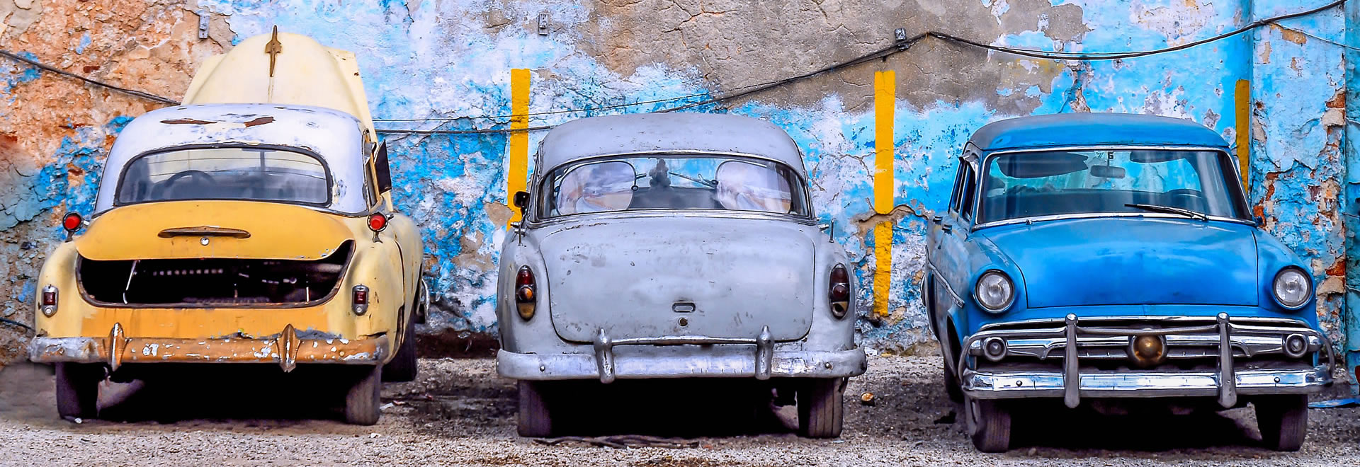 I bakgrunnen henger antikke Chevrolets og Fords, vitner til en svunnen tid som nekter å bli glemt på denne levende øya.