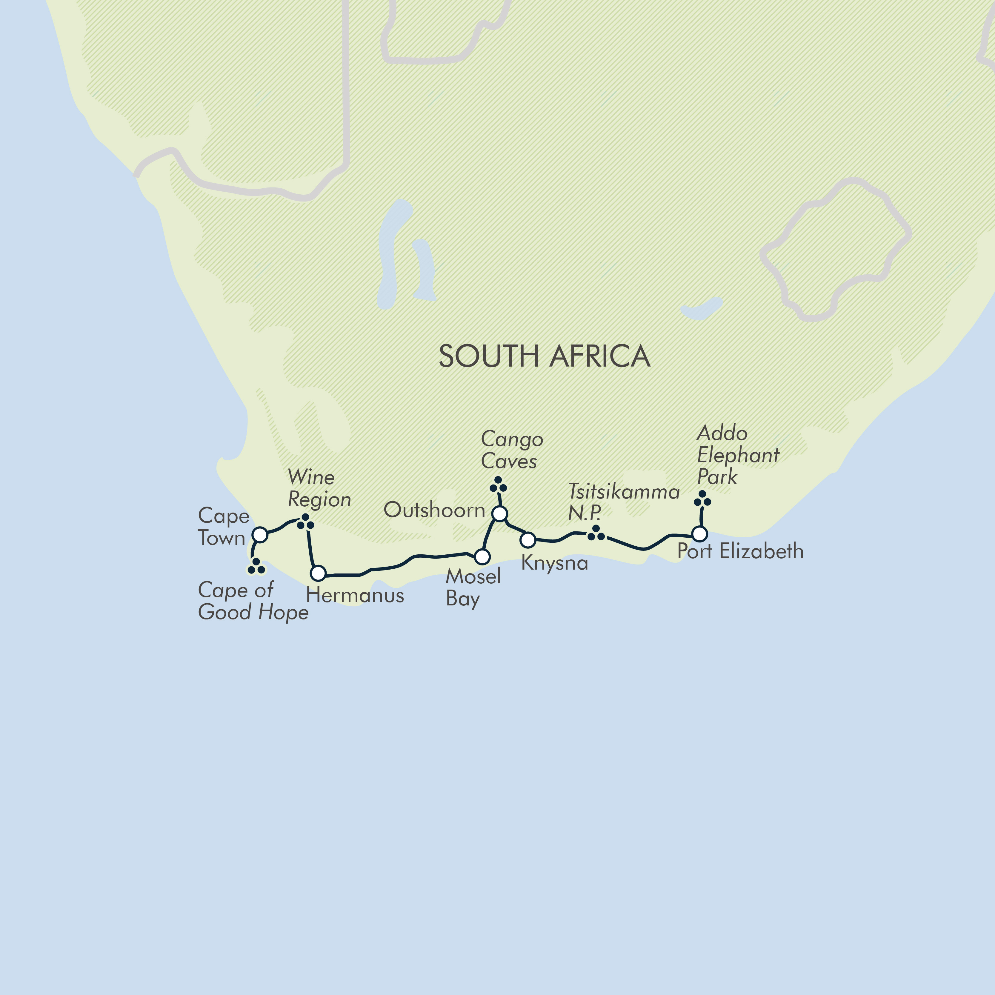 • Explore diverse nature from the forests of Tsitsikamma to the drylands of the Little Karoo