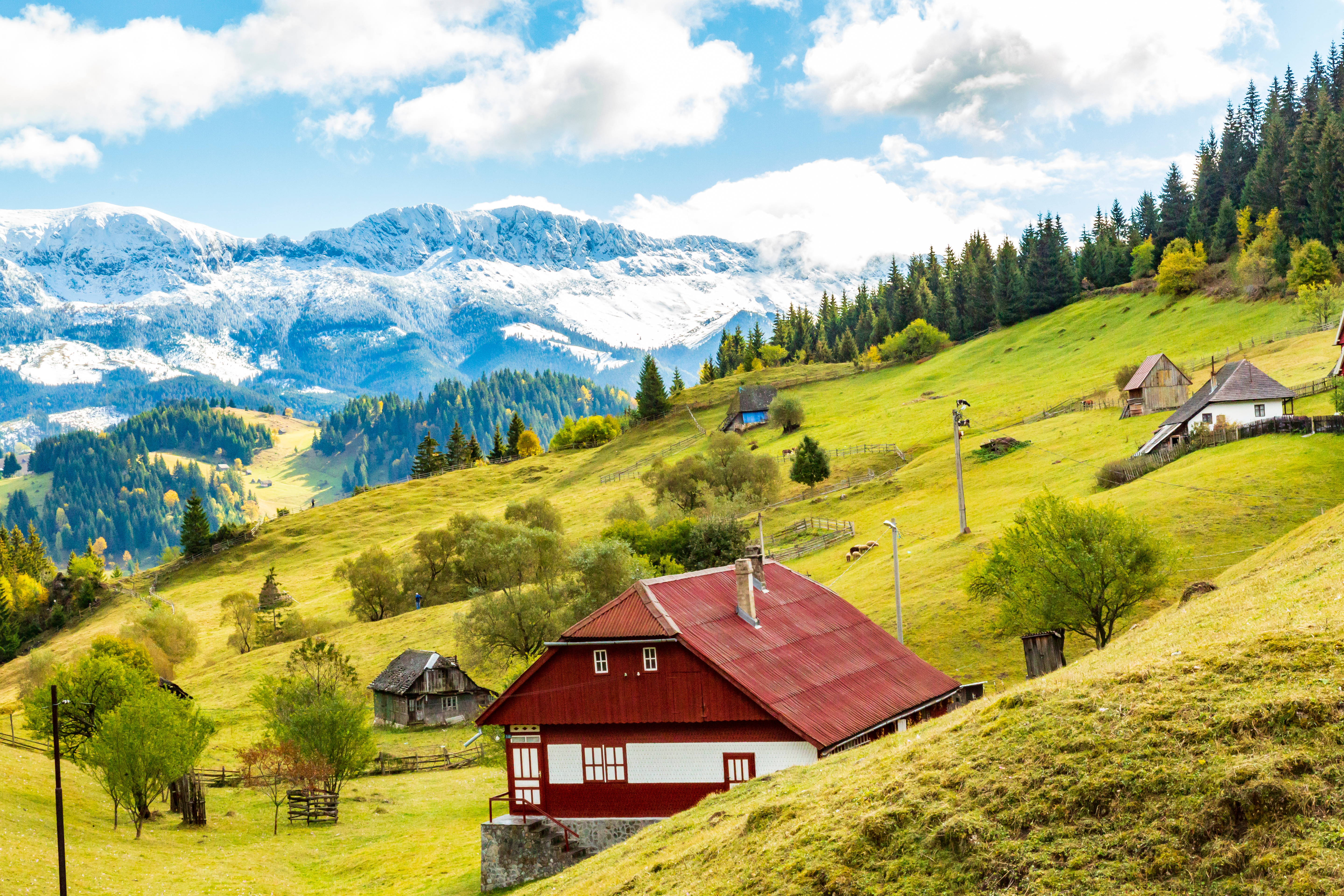 Romania has warm summers and snowy winters. Rainfall is usually quite low except in the mountains; spring and summer are the wetter seasons. The weather changes abruptly from winter to summer and spring is generally short. The Carpathian Mountains can be blanketed in snow until mid to late May at higher altitudes. Summer days are often long and warm with 10 to 11 hours of sunshine, while nights can range from pleasantly warm in the lower valleys to cold at higher elevations. September temperatures tend to be lower than those in July and August but changeable weather with cloud, rain and chilly daytime temperatures can occur at any time of the year. Expect temperatures in the village to be lower than Bucharest.