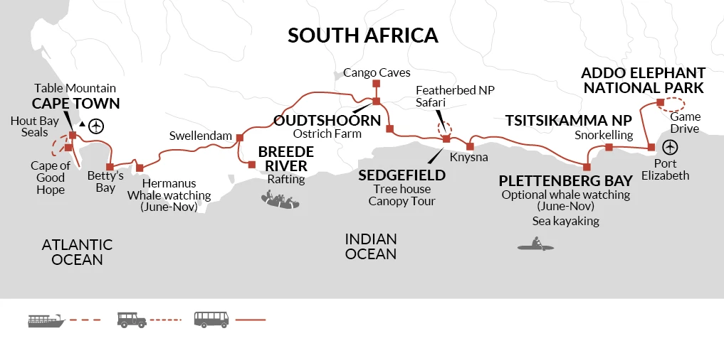 From the top of Table Mountain to the coast of the Indian Ocean, explore the best of South Africa's Garden Route on this family adventure. Experience the thrill of safari, try your hand at river rafting and caving and spot whales along the beautiful coast. Along the way, get closer to nature, camping at rustic lodges and in cabins surrounded by South Africa's stunning wildlife.